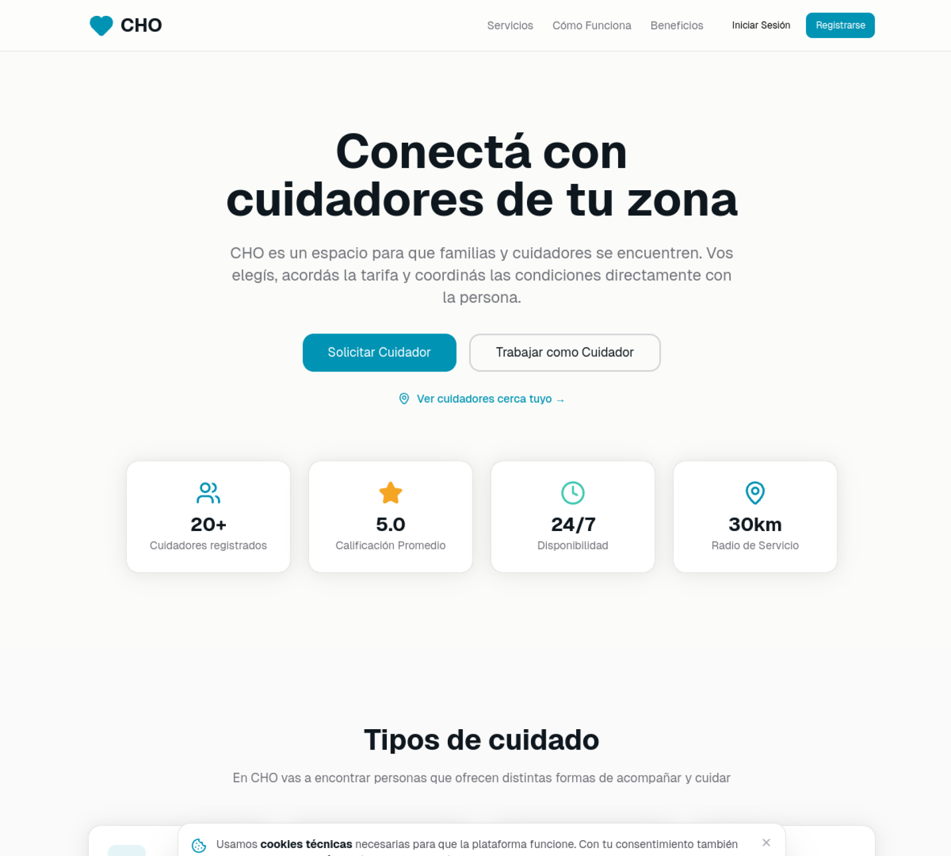 En Argentina, conseguir un cuidador para un familiar mayor o con discapacidad suele pasar por grupos de WhatsApp, referidos o avisos clasificados. Sin verificación, sin reviews, sin transparencia de precios. CHO es nuestra apuesta para transformar ese proceso en algo tan simple como pedir un Uber — pero con la seriedad que el cuidado humano merece.